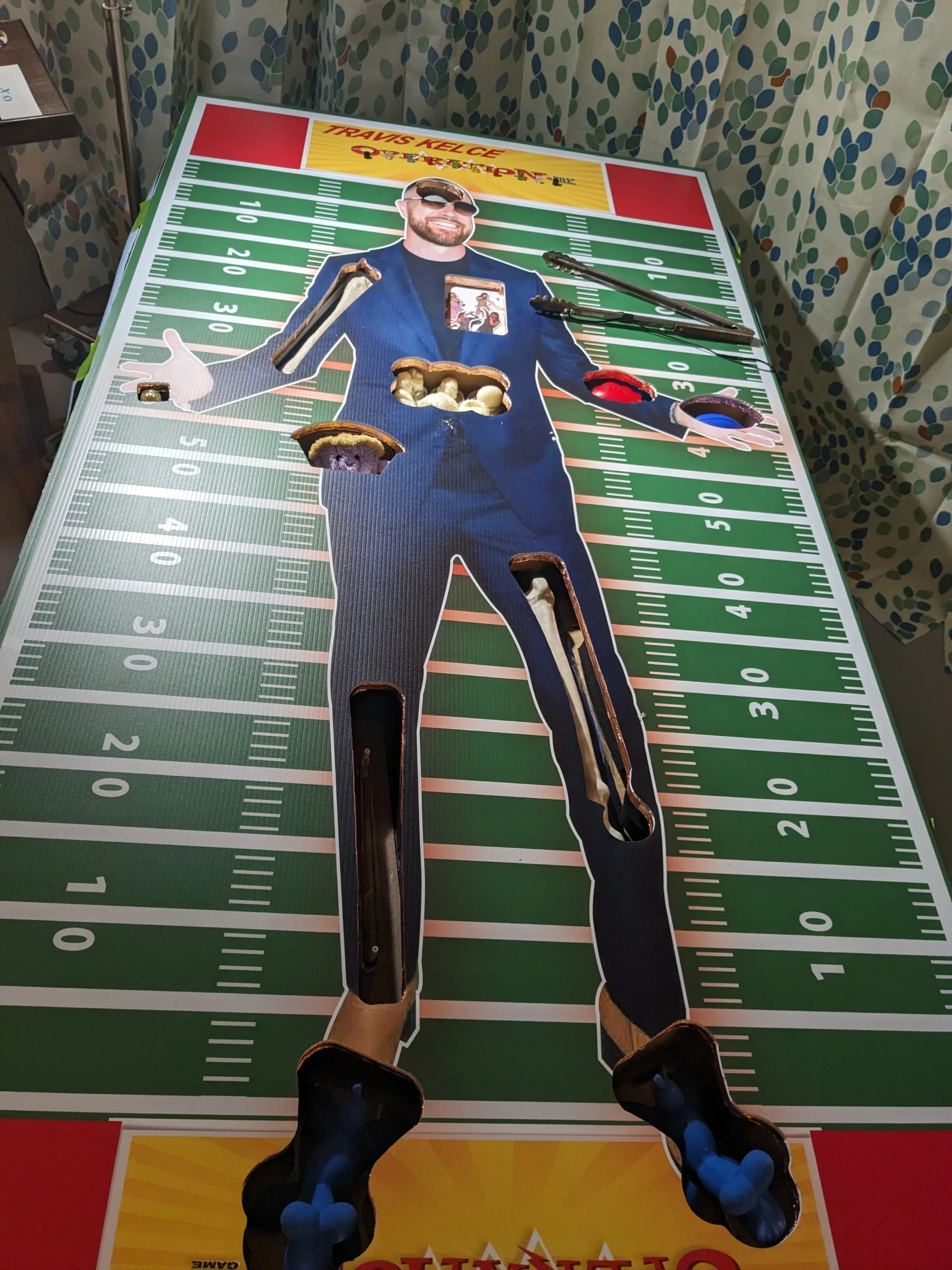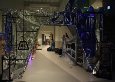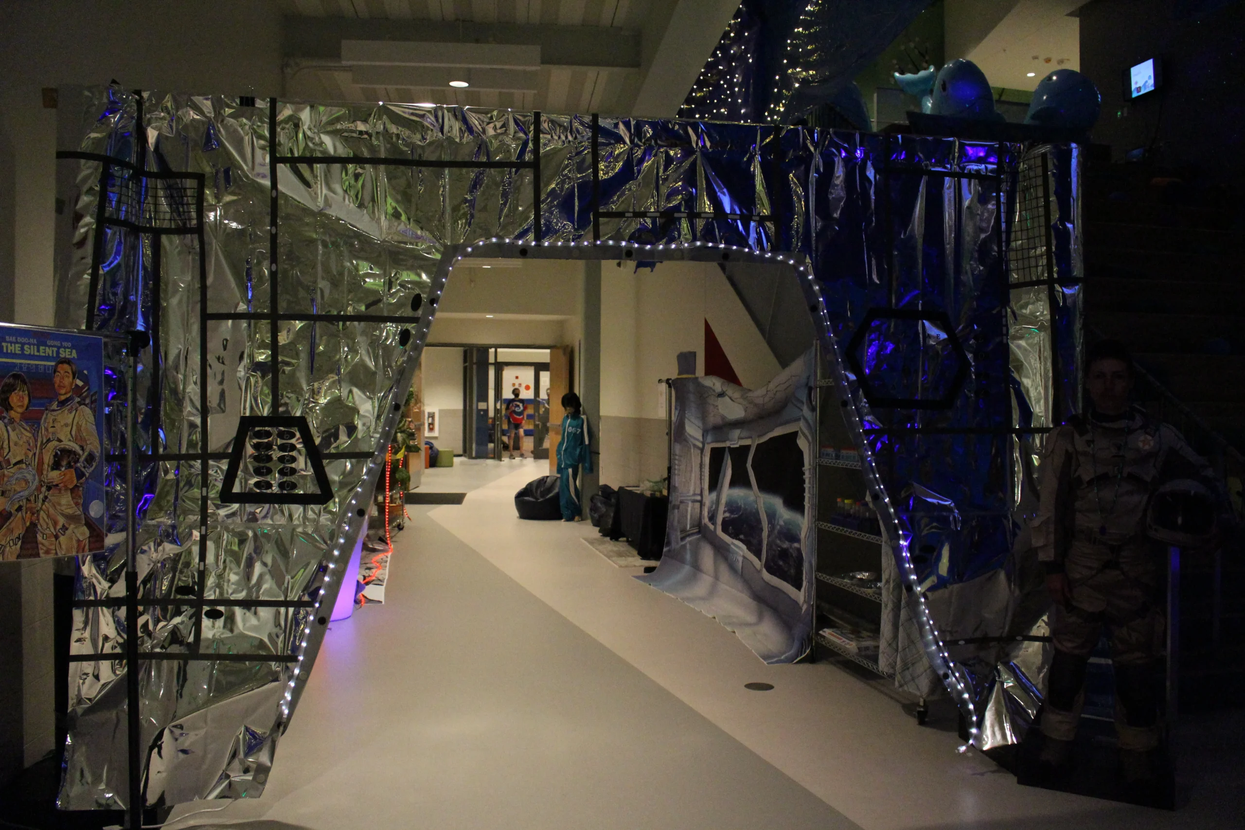 Space theme party with man as astronaut standing in front of a door displaying a sign